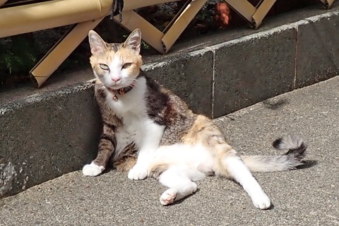 【説明】 塀の袂に寄り掛かって気怠そうにしている猫がいきなり大きなクシャミをして驚く。