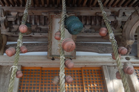 【説明】 拝殿の前には大きめの本坪鈴に加えて小振りの鈴が沢山付けられています。