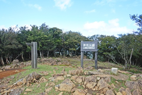(点名:赤石岳))へ出かけました。 2015年にも登っていますが、今回は北側の赤石林道から尾根に取り付いて山頂へ登り、 東側の尾根を峠まで降って加悦双峰公園へ出るルートを周回しました。 赤石林道から山頂までの尾根は、大小の岩が剥き出したり薮漕ぎをする所もあるタフなルートです。 途中でルートを誤ったようで、大きな岩が剥き出す岩尾根を苦労しながら登ることになりました。