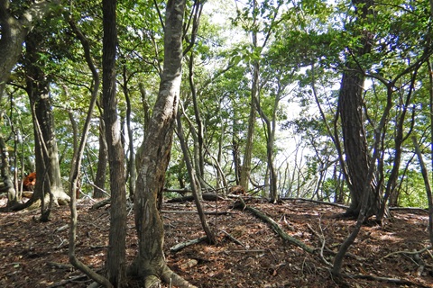 へ出かけました。 北側の作業道の終点から尾根に取り付いて山頂へ登り、 南へ伸びる尾根を進んで電波塔の保守路を降るルートを周回しました。 尾根に明瞭な道はなくプチ薮漕ぎする所もありますが、行く手を阻むほどではありません。 電波塔の保守路には金属網・横木・硬質プラスチック製の階段が途切れながら続いています。