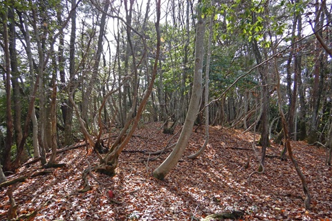 (点名:新畑上)へ出かけました。 県道9号と県道11号の交差点付近を起終点として山頂へ至るルートを往復しました。 標識類は見かけませんが、「界」の赤プラ杭が続いています。 明瞭な道はなくて樹木も茂り気味ですが、行く手を阻むほどではありません。 木の根や岩などに掴まりながら登り降りする急坂もあります。 落ち葉に埋もれているのか、三角点の標石は見つけられませんでした。