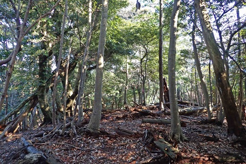 へ出かけました。 濱須井地区にある浜須井トンネルの西側の谷筋を回り込む所から作業道に入り、 途中で尾根に取り付いて山頂へ登り、南東にある八坂神社へ降るルートを周回しました。 尾根に並行する破線の道を歩く予定でしたが、入口を見つけられなかったので、尾根の先端付近から尾根の背を歩きました。 八坂神社へ降る尾根は急坂になっているので、樹木に掴まりながら降りました。