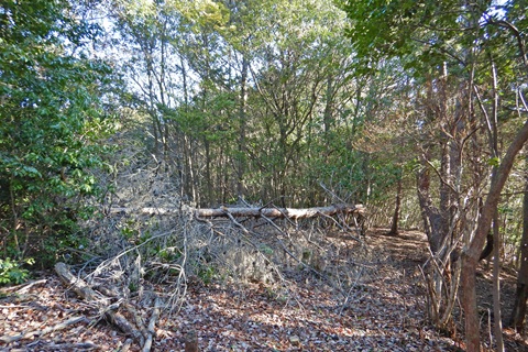 (点名:藤の目)へ出かけました。 JR福知山線の柏原駅の近くの観光者駐車場を起終点として、高谷忠魂殿を経て山頂へ登り、 破線の峠道が尾根を越えていく小峠まで進み、西の斜面を降って谷筋に出るルートを周回しました。 尾根は清水山登山道になっていて、適度な間隔で桃テープが続いています。 西へ降る斜面は次第に道が不明瞭になりますが、桃テープを辿りながら降っていきます。