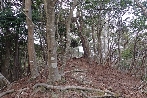へ出かけました。 地区の境にある府道122号の峠付近を起終点として158m峰へ登り、 少し先の小峰を経て南側を通る林道へ降るルートを周回しました。 ルートを示すかのように、赤い矢印板が取り付けられた樹木が点々と続いています。 山頂は樹木が茂り気味ですが、尾根の途中には海岸線やしじら山などを眺められる所があります。