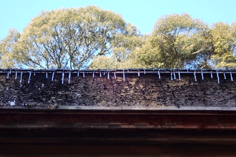 【説明】 社殿の軒先に小さなツララの赤ちゃんが出来ていますが、今後育っていくのでしょうか。