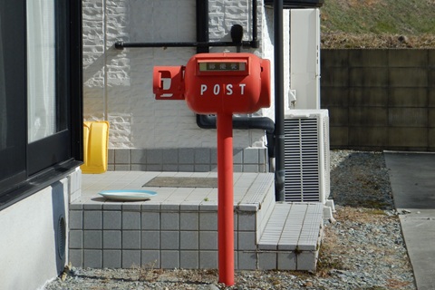 【説明】 民家の前にある郵便受けですが、不用になったガズボンベを活用して自作したのでしょうか。